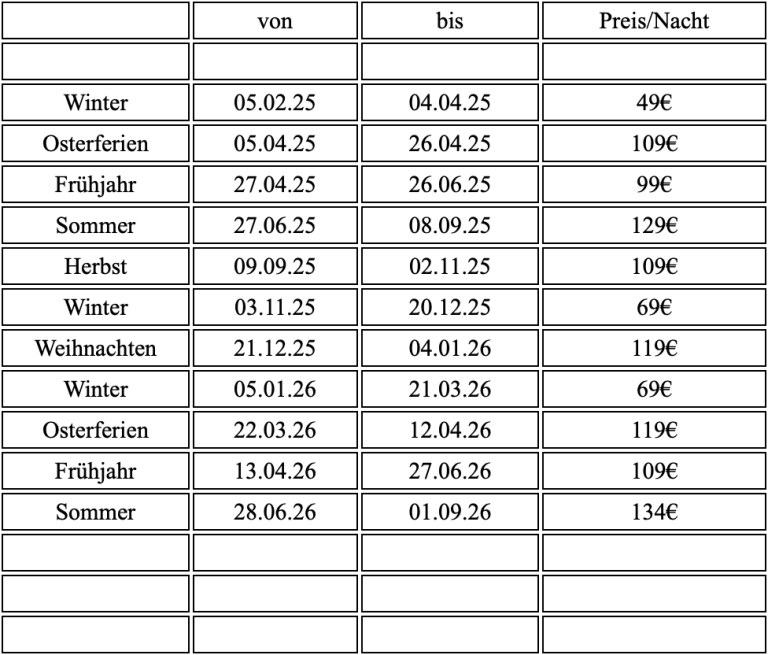 Bis auf die Winterzeiten (2 Tage) gelten Mindestbuchungszeiten von 5 Tagen